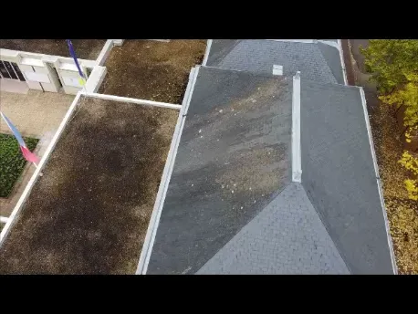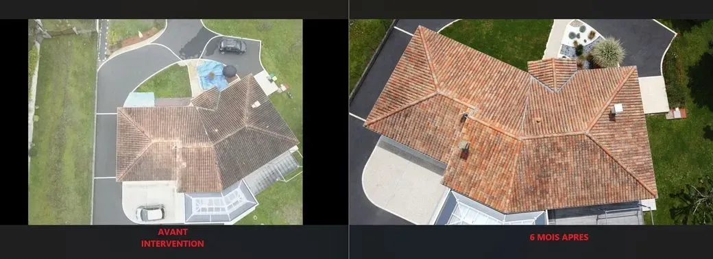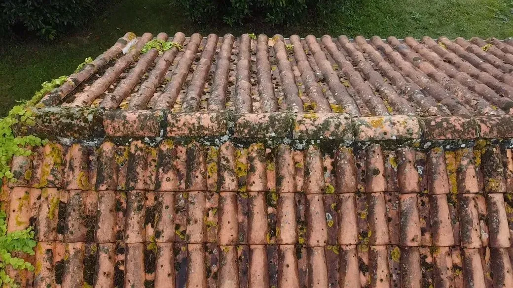 Nettoyage efficace et sûr de toitures tuiles ou ardoise par technologie drone, assurant la suppression de mousses, saletés et débris.